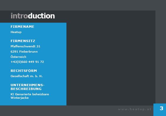 Heatup die Selbstbeheizbare Winterjacke ladet sich durch Sonnenstrahlen auf, ganz ohne die Nutzung von Strom. Unsere Jacke merkt, wie viel Wärme sie benötigen, und welche Aktivitäten Sie treiben so kann sie die Wärme Optimal verteilen. In der App können Sie die Farbe der Jacke ganz nach Belieben ändern, ganz nach Ihrem Style, denn wer möchte schon eine stillose Winterjacke, mit Heatup haben Sie nie mehr die Sorge unmodisch auf den Skipisten zu sein.
